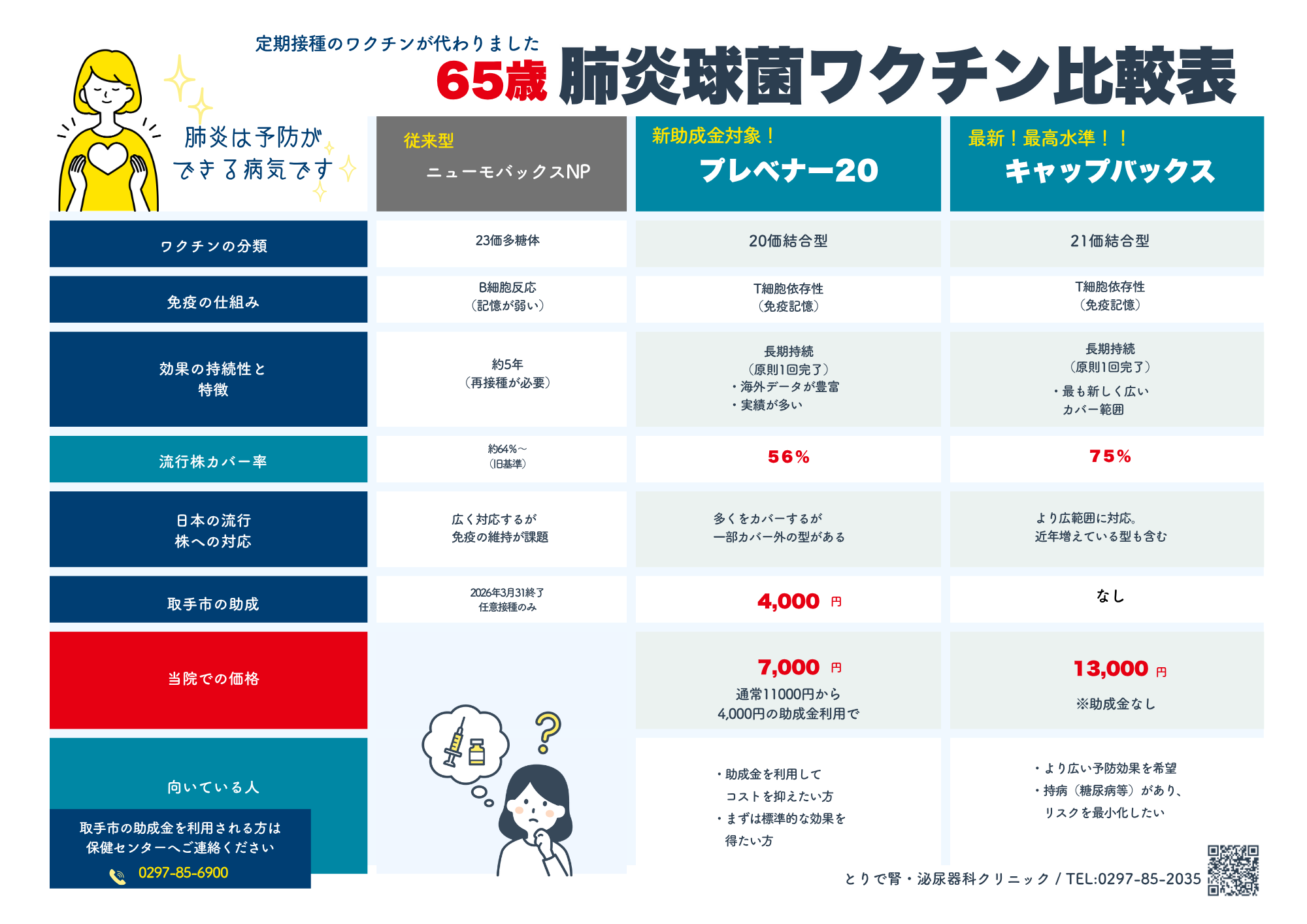 肺炎は「防げる病気」へと進化しています。 「自分はいつ、どちらを打つのがベストか?」 診察室にて、これまでの接種履歴や持病の状態を確認しながら、お一人おひとりに最適なプランをご提案します。大切なお体のために、ぜひお気軽にご相談ください。